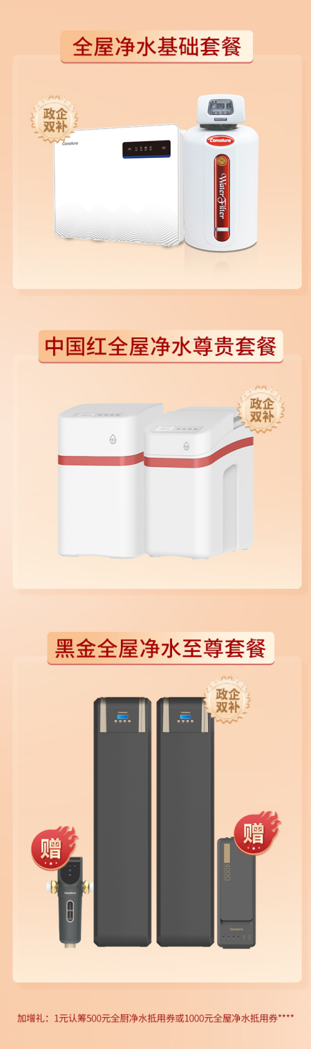 活动期间,1元认筹500元全厨净水抵用券或1000元全屋净水抵用券