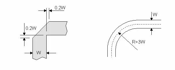 RF信号线如果走直角,拐角处的有效线宽会增大,阻抗不连续,引起信号反射。为了减小不连续性,要对拐角进行处理,有两种方法:切角和圆角。圆弧角的半径应足够大,一般来说,要保证:R>3W。如图右所示。