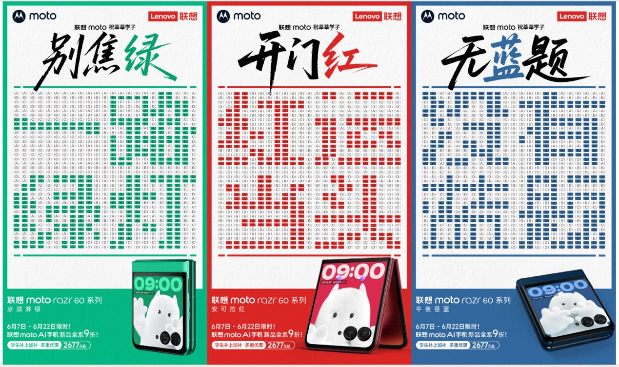 针对广大高考毕业生和大学生朋友,6月7日至6月22日期间,联想motoAI手机新品全系限时9折,叠加国补与联想大学生教育特惠的背景下,联想moto razr 60系列小折叠仅需2677元起,联想moto edge 60系列仅需1300元起。近期有换机需求的用户,千万不要错过这个绝佳时机!