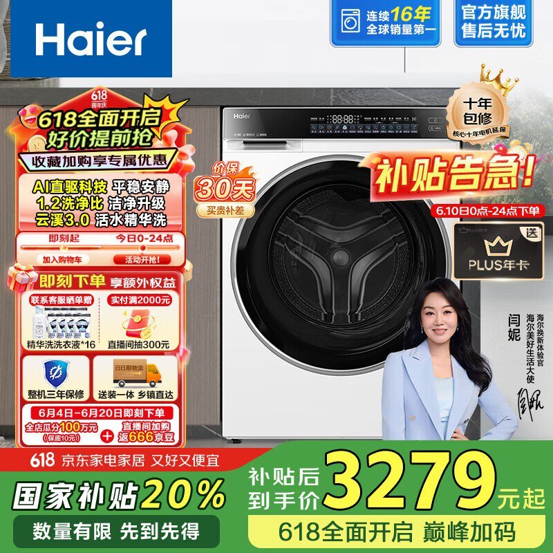 海尔云溪3.0滚筒洗衣机,大容量静音节能,限时特惠2527元