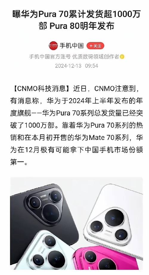 从预热视频到专利技术,从硬件创新到算法猜想,华为Pura 80系列展现出了强大的影像领域的积累,打造了友商难以复刻的技术壁垒。回顾华为Pura系列的发展历程,上一代华为Pura 70系列出货量已突破1300万台,足以证明市场对其影像能力的认可。
