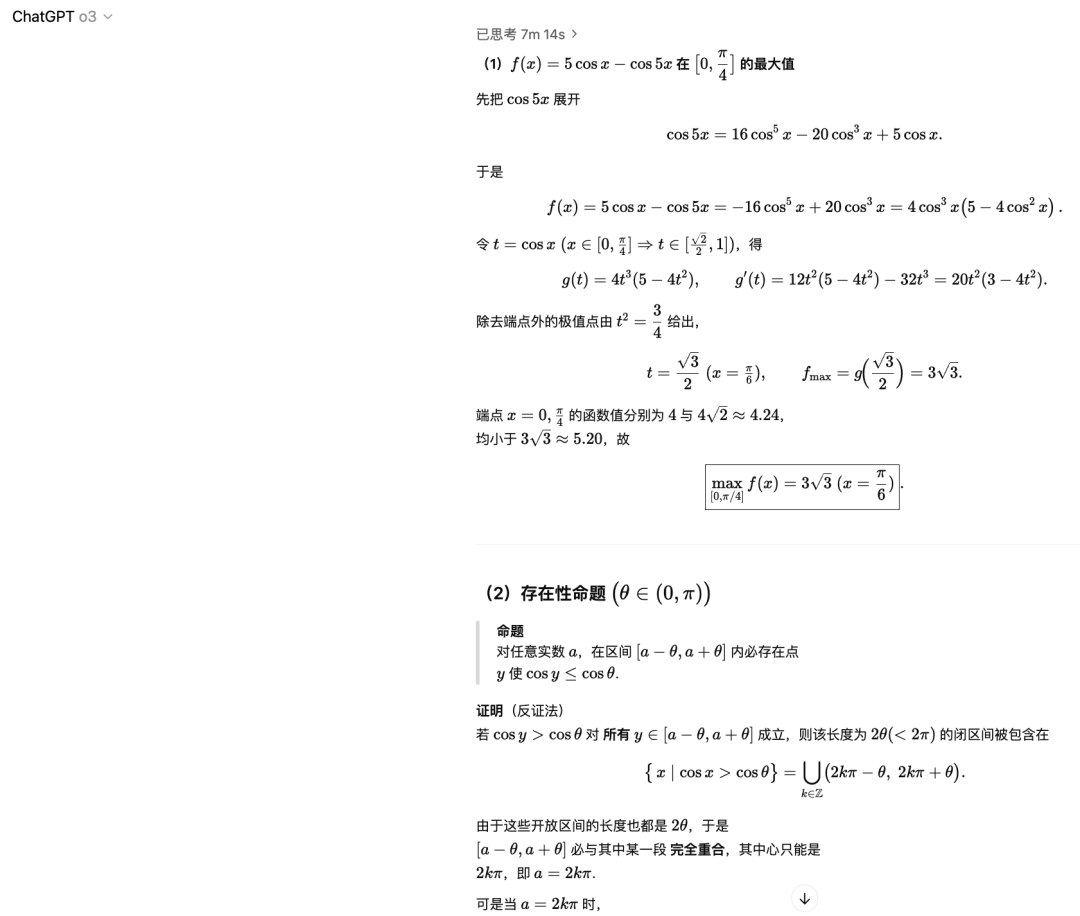 对于最后一道压轴题,Gemini2.5 pro 是唯一全对的大模型。Doubao 只说明了震荡项的振幅大于 0,但是也有可能震荡项的相位是反的,那样的话最大值反而有可能更小,证明过程不够严谨,扣一分。