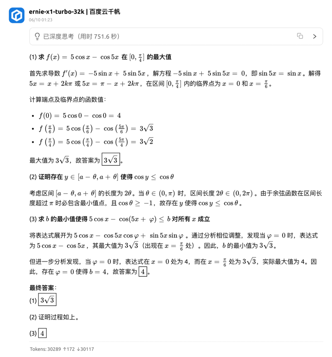 文心 X1 和 Qwen3 也都是在第 2 问和第 3 问上失了分,第 2 问证明模糊扣 2 分,第 3 问则是未具体说明 phi 值扣 2 分,而且文心 X1 比大小还发生错误,又扣了 1 分。