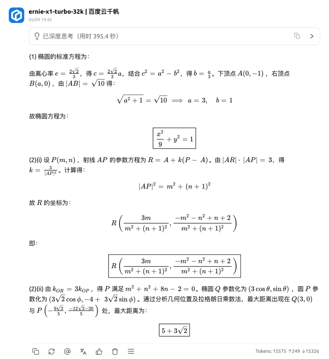 文心 X1 在第 2 问 (2) 正确算出 P 点轨迹,但未证明极值,直接按最远点计算造成结果错误,扣 6 分。