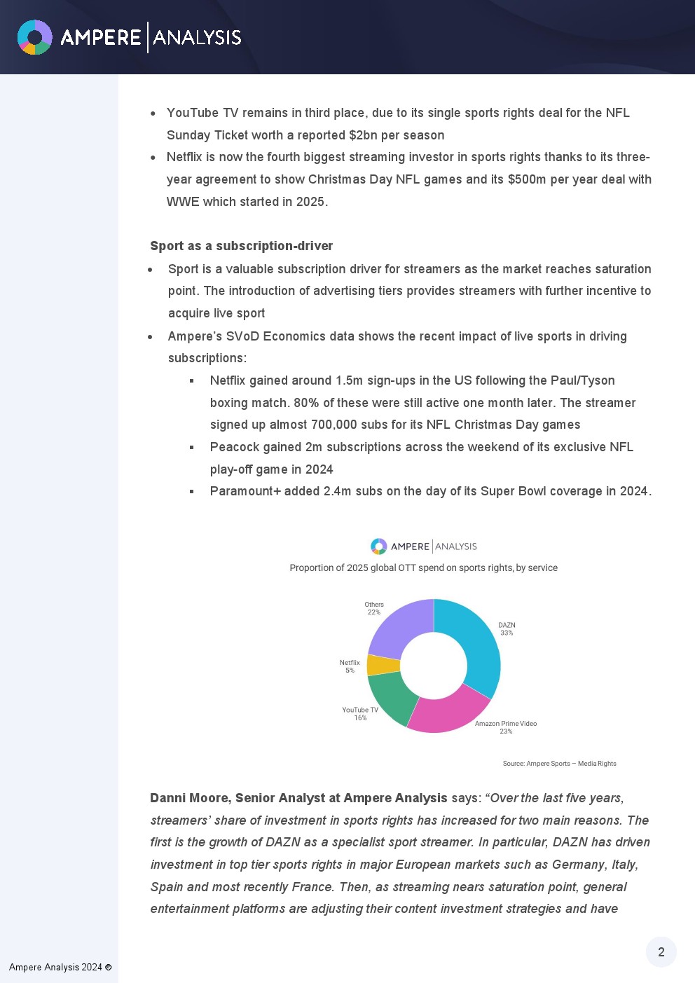 • DAZN将继续保持体育版权流媒体支出第一的位置。2025年该平台将占流媒体体育支出的1/3,这得益于其以10亿美元获得2025年国际足联俱乐部世界杯版权的交易。DAZN完成对澳大利亚Foxtel的收购后,其在全球体育版权市场的份额还将进一步提升。