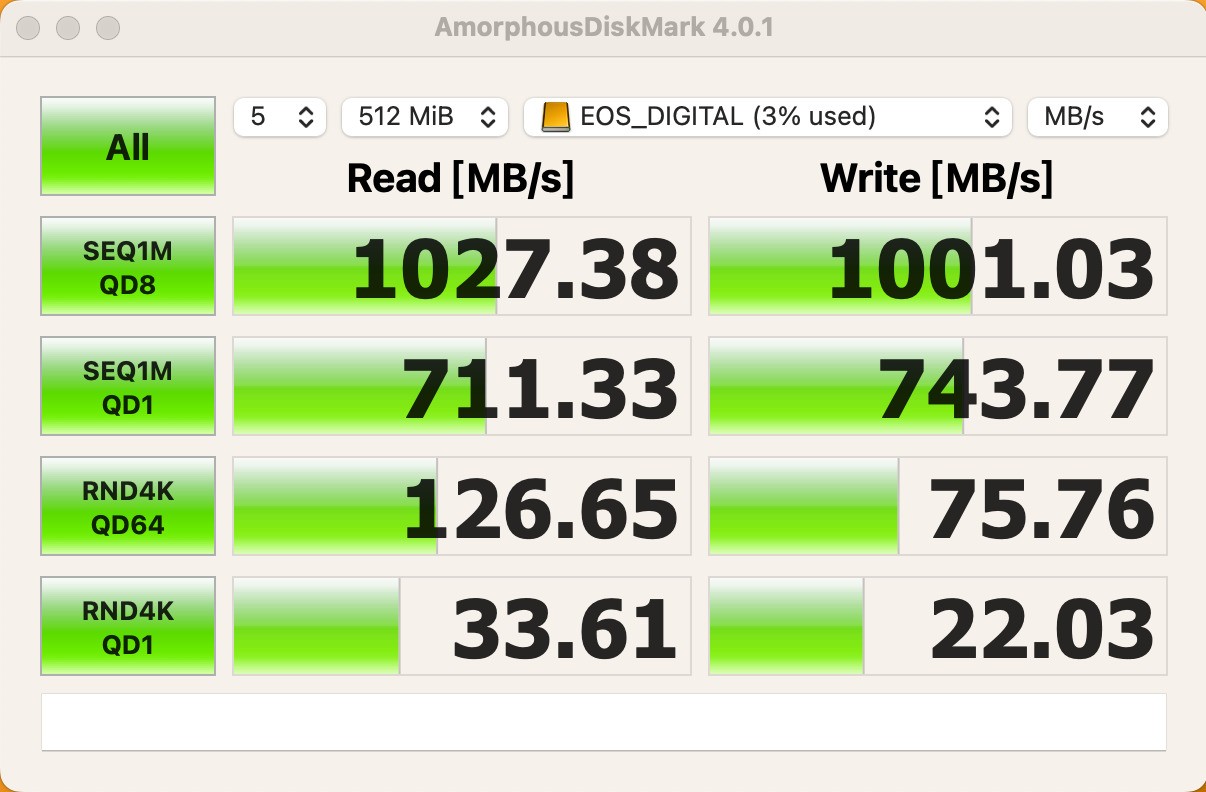 通过Crystal DiskMark这款比较主流的存储设备基本性能测试工具进行跑分测试,闪迪专业影视CFexpress Type-B存储卡这张存储卡的读取速度达到了1027.38MB/s的读取速度以及1001.03MB/s的写入速度。