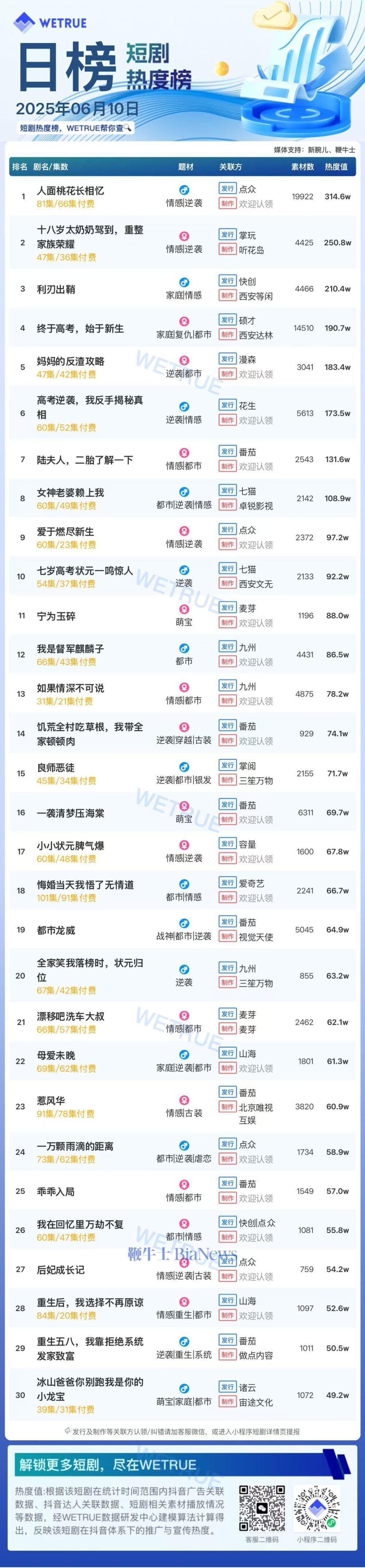 1、本日榜为WETRUE短剧数据公司提供,新腕儿和鞭牛士提供联合支持。
