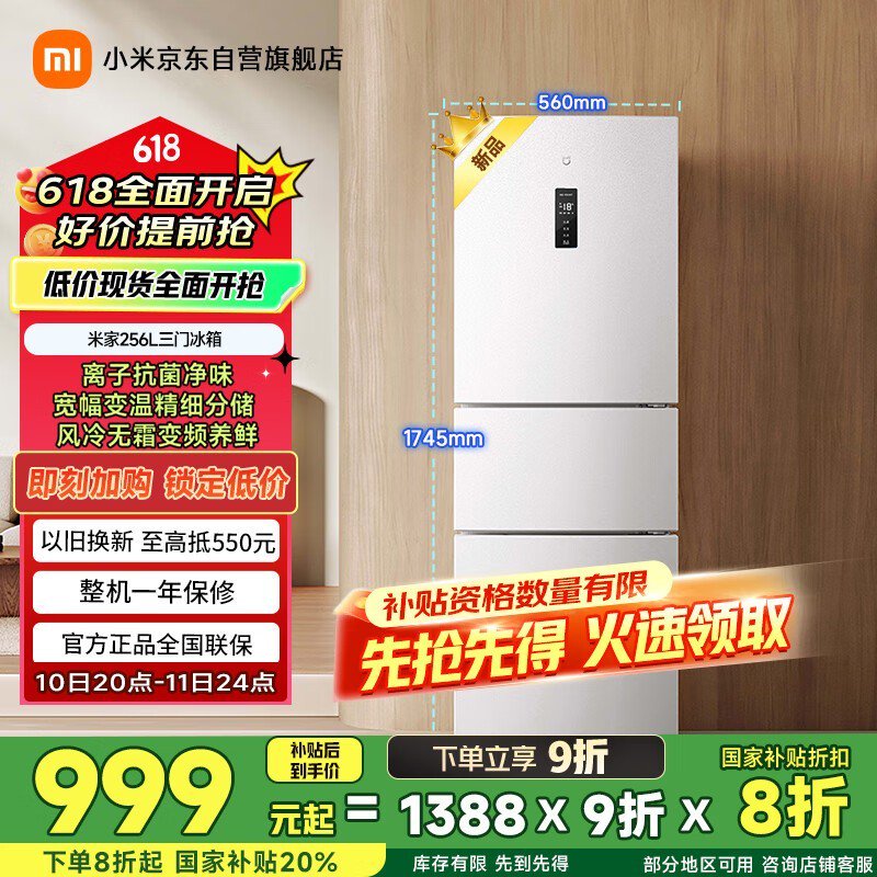 米家小米256升三门冰箱,京东活动价999元