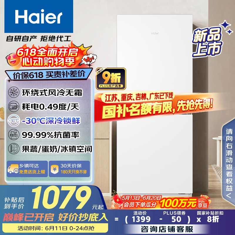海尔193升两门冰箱京东优惠低至1002元