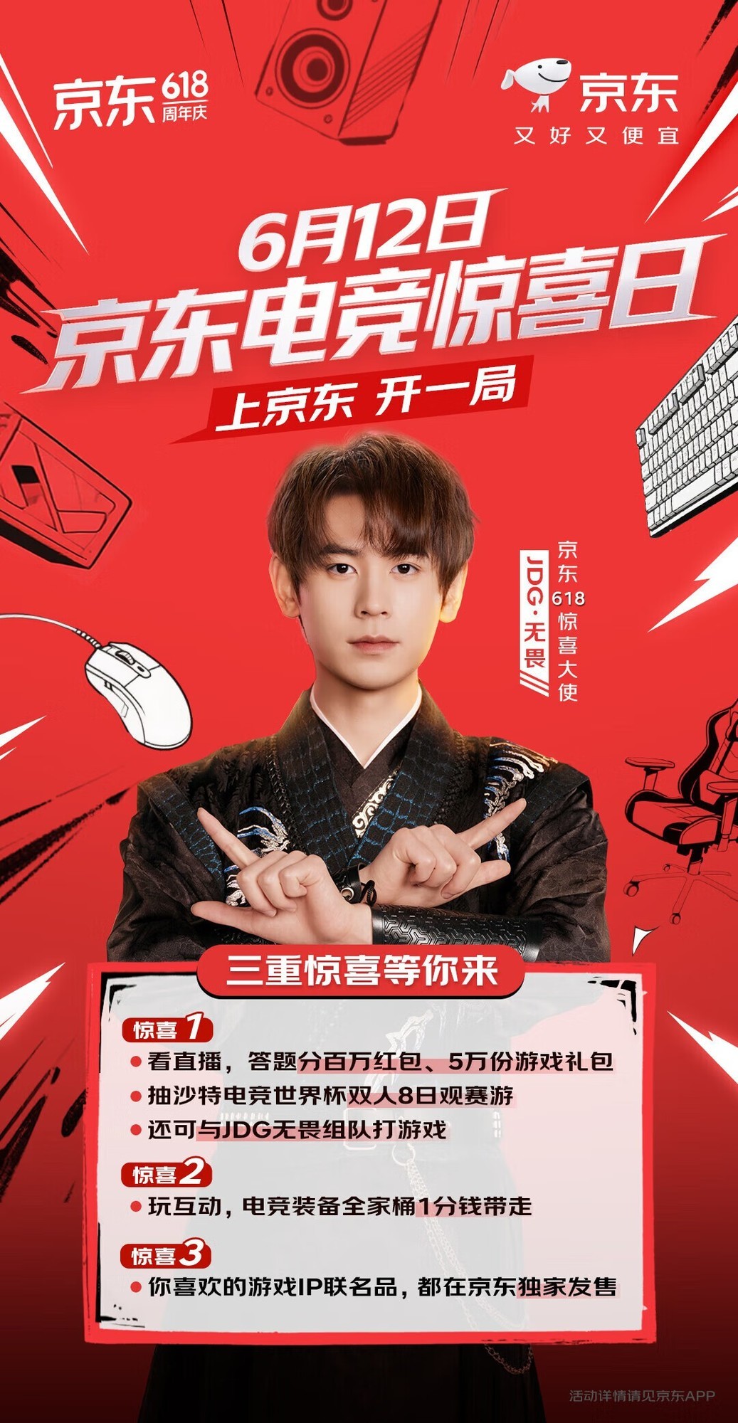 京东618正在火热进行中,6月12日,京东携手多款知名游戏IP开启电竞惊喜日,为广大游戏玩家带来键鼠、游戏台式机、游戏笔记本、显卡、游戏耳机等电竞装备好物。用户打开京东APP搜索“电竞惊喜日”即可进入活动会场。此外在电竞惊喜日当天,用户来京东头号玩家直播间观看直播答题还能分百万红包与5万份游戏礼包,电竞装备全家桶等好礼均可1分钱带走,还有机会赢得与JDG无畏组队陪你打游戏、沙特双人8日观赛游等惊喜大奖。电竞装备更可享国家补贴叠加以旧换新补贴双重优惠,到手价低至4折,一站式购齐电竞装备,还能通过互动参与抽奖,有机会1分钱带走外星人套装、索尼PS套装、DIY电脑全家桶等游戏装备豪礼!心动的朋友不要错过,记得提前锁定京东。