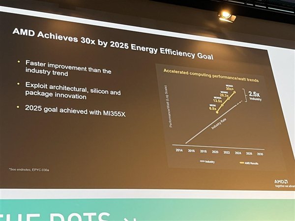 Papermaster还透露了AMD在AI产品提升能耗方面的目标,随着下一代MI355X AI加速器,预计效率指标将提高30倍,成功满足预期并领先于竞争对手。