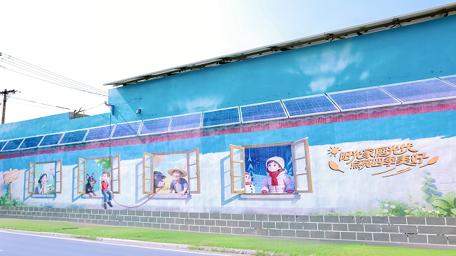 雪白的墙面上,光伏板像整齐的琴键铺满屋檐,四扇窗格盛放着四季光影。这幅墙绘,描绘着三家村的新气象,也悄然诉说着村庄与新能源结缘的故事。