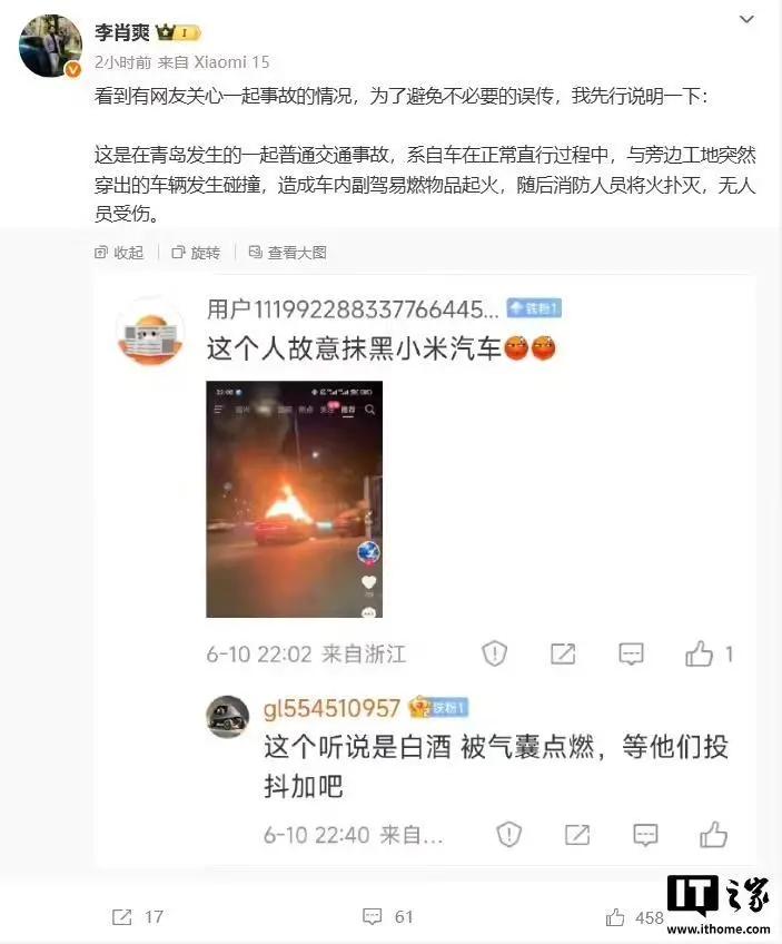 6 月 11 日消息,今日小米汽车副总裁李肖爽发文,对网传的青岛一辆小米汽车着火视频进行说明。