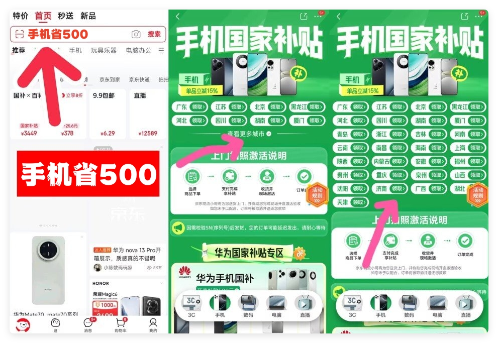 首先,划重点!手机数码国补的领取方法是:京东APP搜「手机省500」或「数码省2000」国补直接立减2000元,家电国补的领取方法是:京东APP搜「家电省2000」领取。