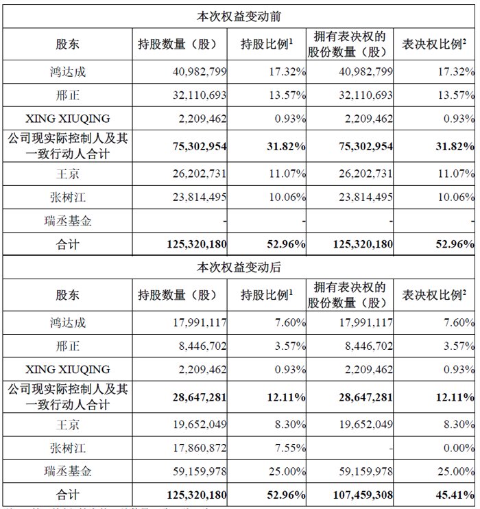 瑞丞基金拟协议收购鸿达成及邢正、王京、张树江合计持有的公司59,159,978股股份,占公司股份总数的25.00%。同时,张树江与合肥瑞丞签署了《表决权放弃协议》,张树江拟放弃剩余持有的公司17,860,872股股份(占公司股份总数的7.55%)对应的表决权。鸿达成、XING XIUQING、邢正、王京和张树江出具了《关于不谋求上市公司控制权的承诺函》。