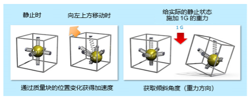 右图表示通过质量块位置检测倾斜角度的原理。给实际的静止状态施加1G的重力。当箱子倾斜时,质量块的位置发生变化,由于重力方向已知,因此可以检测出倾斜角度。