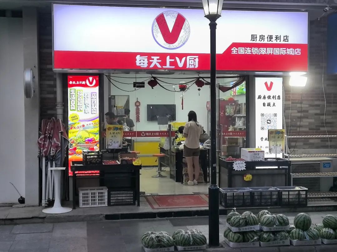 到了2023年6月,公司内部数字化系统与供应链成熟,V厨开始把线上内容延伸到线下门店。店面统一以“V厨”命名,门头极简,只突出“V厨”符号。对周边居民而言,一个直接对应“做饭需求”的门头,很容易在琳琅满目的社区零售里脱颖而出。