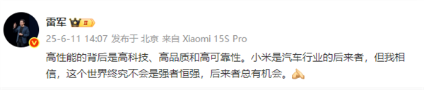 午后,雷军再次下场回应了央视的点赞:高性能的背后是高科技、高品质和高可靠性。小米是汽车行业的后来者,但我相信,这个世界终究不会是强者恒强,后来者总有机会。