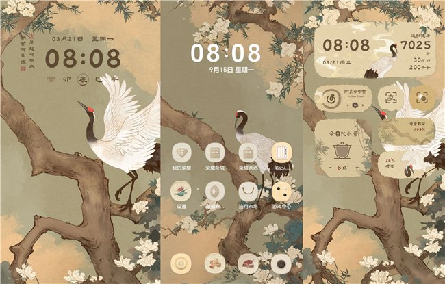 而作为精品主题品牌栏目的“甄选集Art”,一直以先锋美学构建创作标准的理念,通过携手一众知名艺术家为用户带来独特的美学体验。以《枯木又逢春》主题作品为例,由2024年 HONOR Talents 荣耀全球设计大赛手机主题赛道亚军汤婷婷受邀参与创作,她在看到被誉为“扬州八怪”之一、清代著名画家李鱓的作品时,获得“枯树绽放生机”的灵感,借助荣耀主题提供的数字化创作工具,对李鱓作品里的传统美学意境进行转化,将“破笔泼墨"技法进行数字化重生,再加上枯木、竹叶、丹顶鹤等的意象再造,使传统美学在科技载体中实现新表达。
