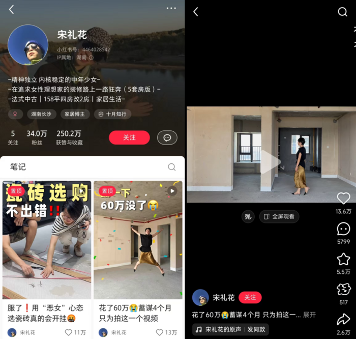 与其他装修博主不同,@宋礼花 的内容和人设更具特点,也更容易在小红书扎根。