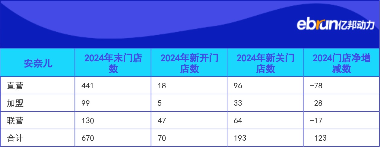 | 安奈儿 | 2024年末门店数 | 2024年新开门店数 | 2024年新关门店数 | 2024门店净增减数 |