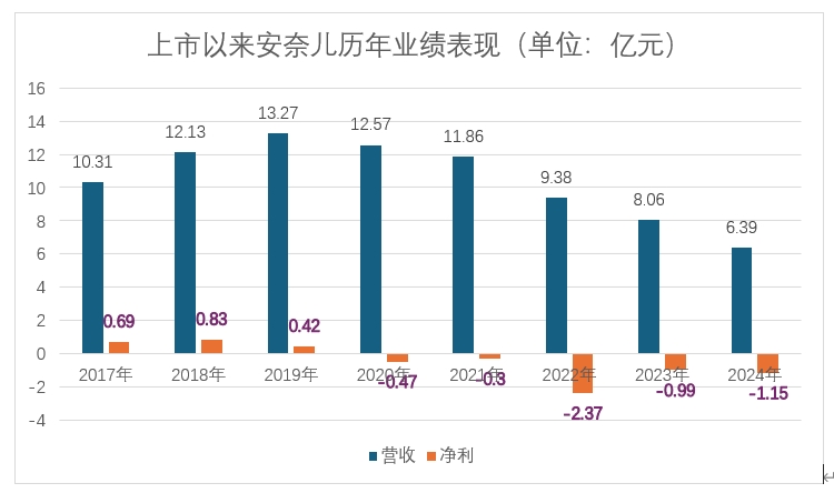 但仅一年后,安奈儿的净利润便下跌49.49%,2020年至2024年间,连年亏损,五年间累计亏损近5亿元。