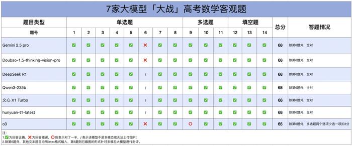 在不考虑识图题(第6题)的情况下,客观题大模型总体表现都不错,Doubao、Qwen3、Gemini 2.5 pro、DeepSeek R1 、文心 X1 Turbo 和 hunyuan-t1-latest 均取得了 68 分的高分,只有 o3 在多选题上少选了一项丢了分。
