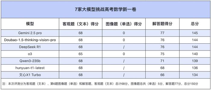 从总分上来看,Gemini 2.5 Pro 考了 145 分,位列第一,Doubao 和 DeepSeek R1 以 144 分紧随其后,并列第二;o3 和 Qwen3 也仅有一分之差,分别排在第三和第四。受解答题的「拖累」,hunyuan-t1-latest 和文心 X1 Turbo 的总成绩排到了最后两名。