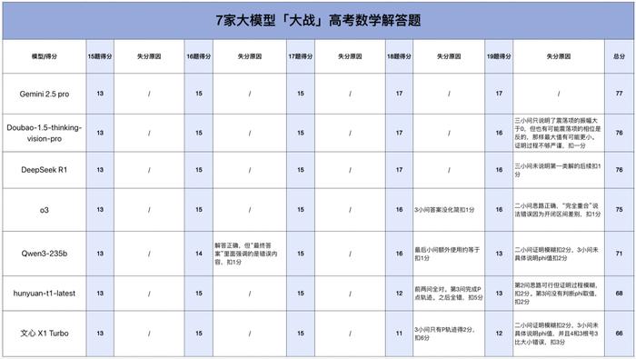 解答题是大模型失分的「重灾区」。除了 Gemini 2.5 Pro 拿到全部的分数外,其它模型或多或少均有失分。其中 DeepSeek R1 和 Doubao 最可惜,只丢了一分;o3 则失了 2 分,最终得到 75 分。相较而言,hunyuan-t1-latest 和文心 X1 Turbo 发挥不佳,分别拿到 68 分和 66 分。