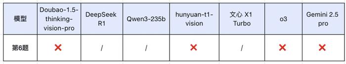 此外,所有参测的多模态大模型在第 6 题的图像识别上都出现了问题,这也暴露出当前 AI 在图文结合理解方面的短板。