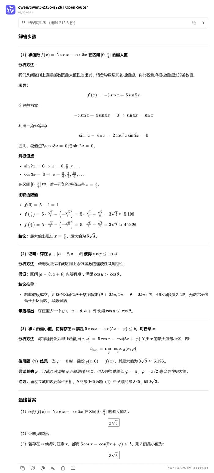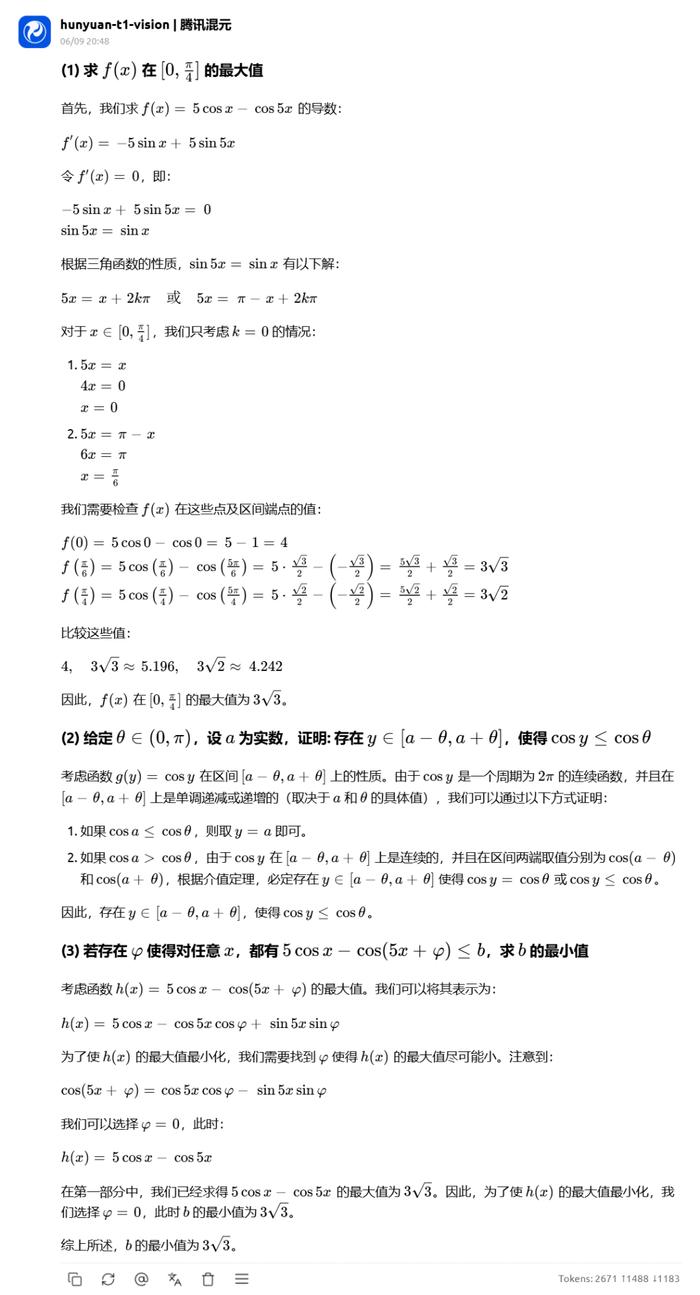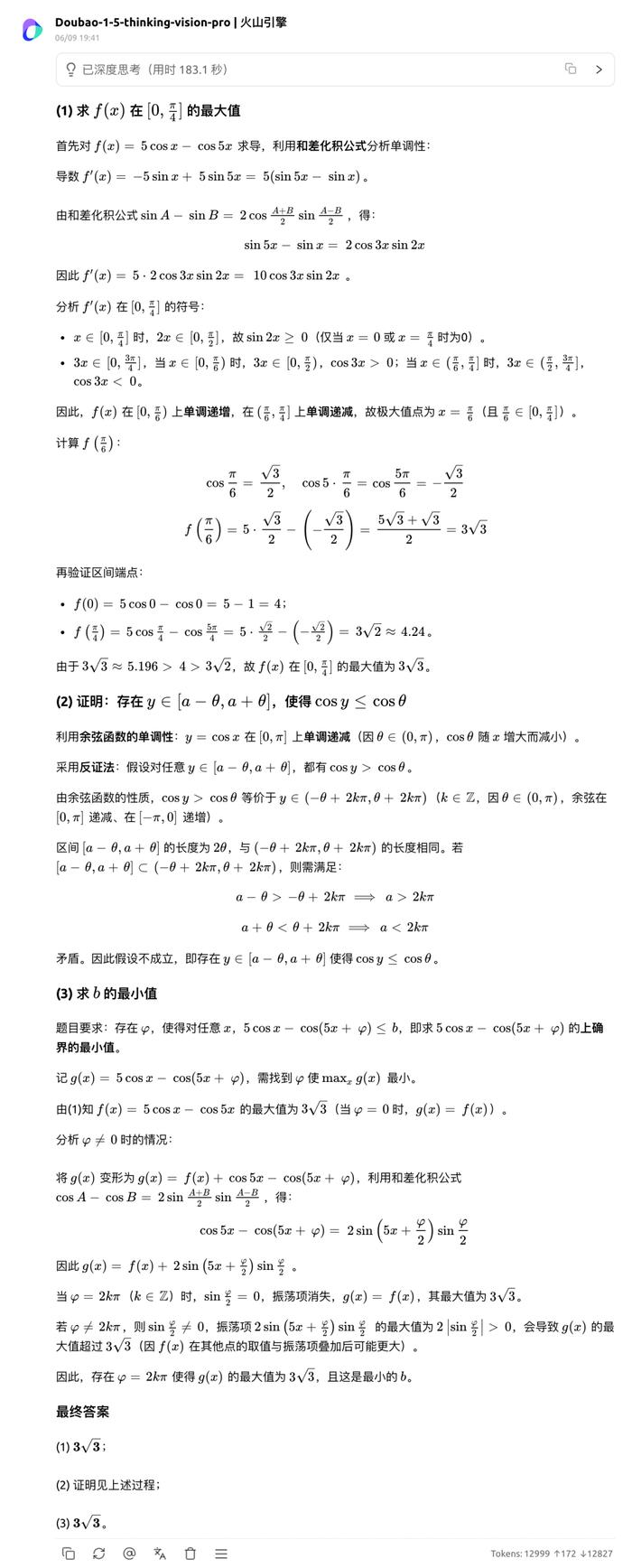 对于最后一道压轴题,Gemini2.5 pro 是唯一全对的大模型。Doubao 只说明了震荡项的振幅大于 0,但是也有可能震荡项的相位是反的,那样的话最大值反而有可能更小,证明过程不够严谨,扣一分。
