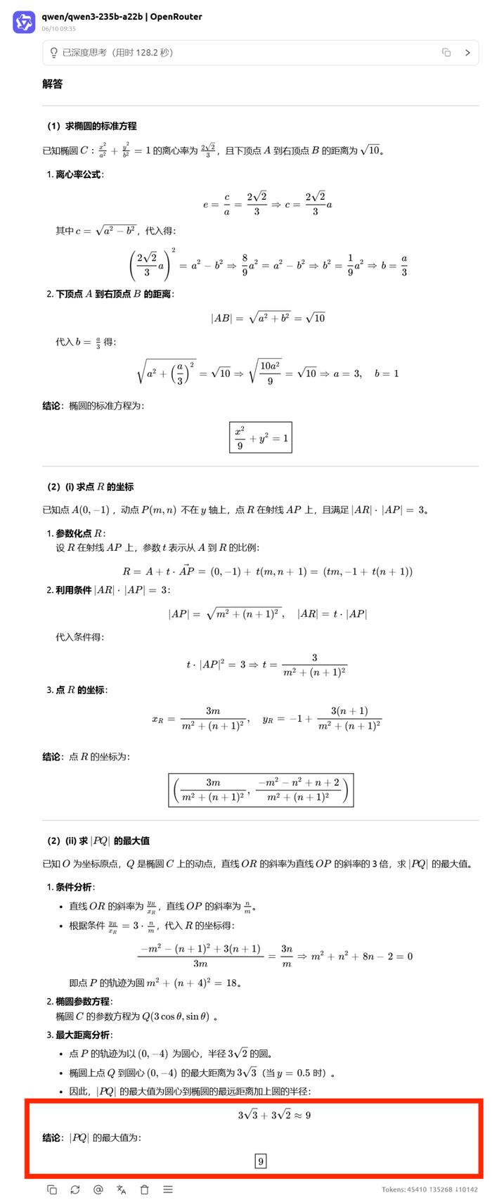 第 18 题这道椭圆方程与几何就难倒了不少大模型,仅 Doubao、DeepSeek R1 和 Gemini2.5 Pro 拿到满分 17 分,其他模型各有各的扣分点。Qwen3 前面回答得都不错,过程也很完整,但偏偏最后一小问|PQ|最大值取约等于 9 的步骤多余,导致结果偏差,扣了一分。
