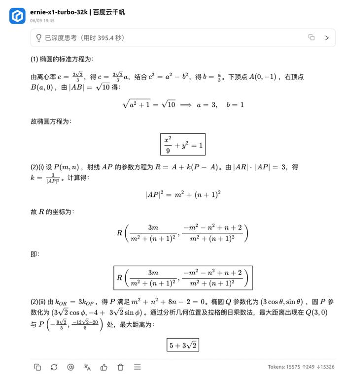 文心 X1 在第 2 问 (2) 正确算出 P 点轨迹,但未证明极值,直接按最远点计算造成结果错误,扣 6 分。