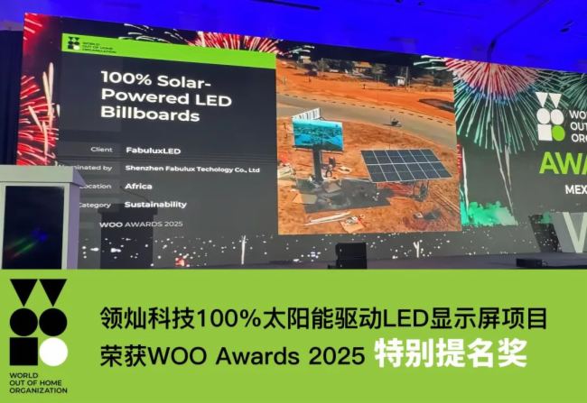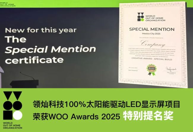 近日,全球户外广告行业权威机构——世界户外广告组织(WOO)在墨西哥城正式公布年度奖项评选结果,领灿科技凭借其“100%太阳能驱动LED显示屏项目”,在推动偏远地区数字化基础设施建设方面的创新实践,荣获“特别提名奖”。