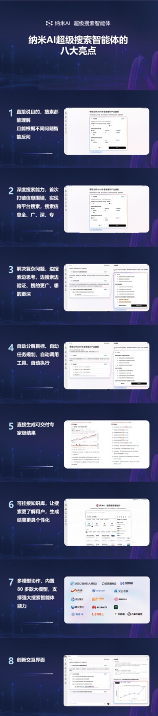 据介绍,纳米AI超级搜索智能体的八大核心亮点包括: