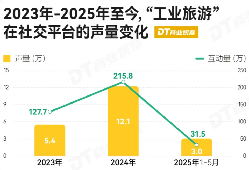 其实早在2024年,“工业旅游”的社媒声量和互动量就开始变高,同比2023年上涨了125%。到了2025年有所回落,截至5月底其声量大概是去年的1/4。