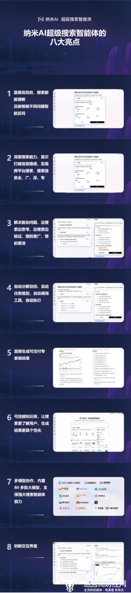 据介绍,纳米AI超级搜索智能体的八大核心亮点包括: