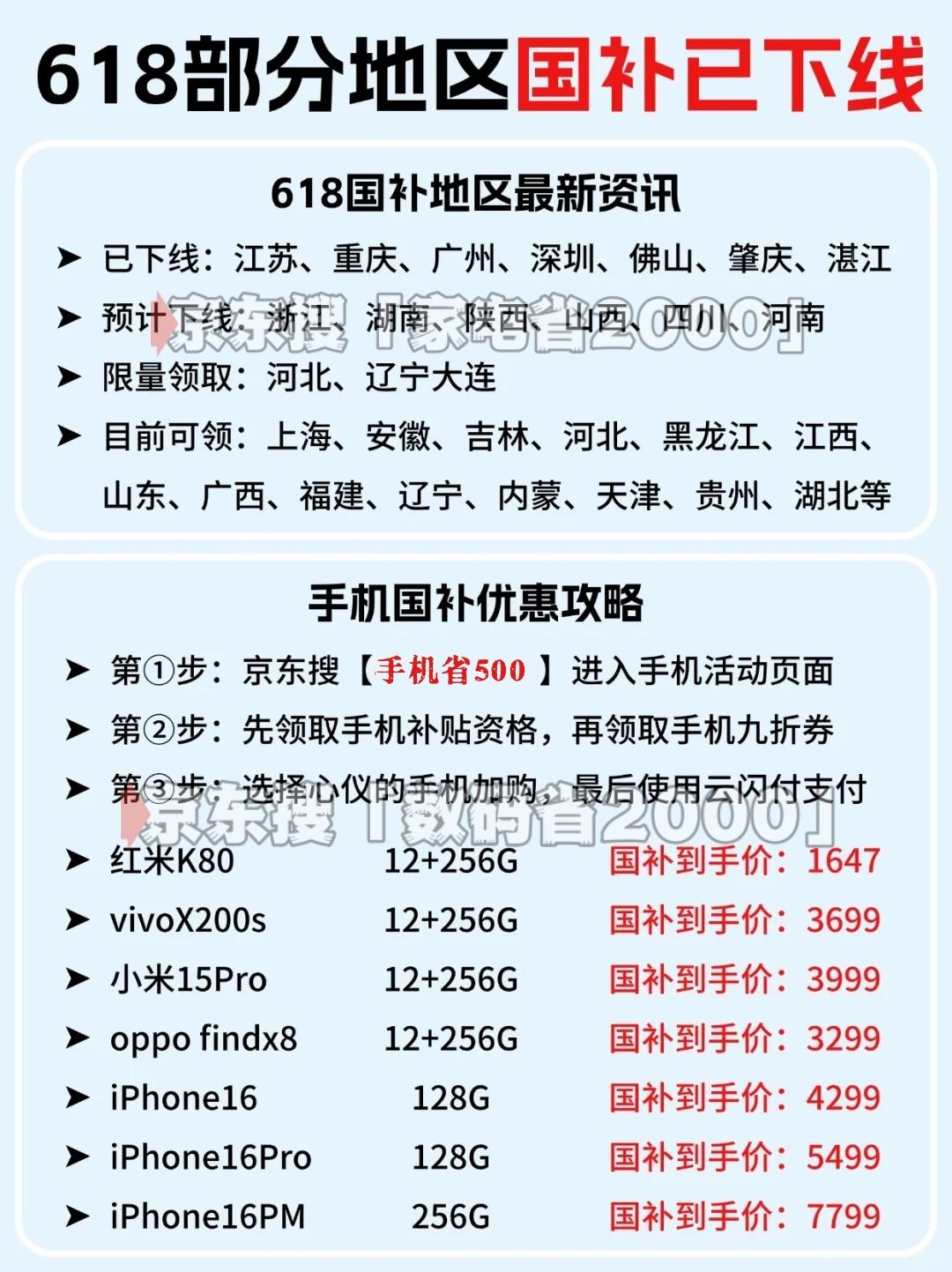 一、多地暂停的真相:资金耗尽与系统调整 1. 补贴资金“青黄不接” - 重庆:首轮12亿元家电补贴资金于6月初耗尽,线上申领通道暂停。市商务委表示第二轮政策预计6月上旬出台。 - 江苏:6月1日起因平台整改启动限额管理,线上页面显示“活动升级中”,线下渠道仍可参与。 - 广东:广州、佛山等地智能家电补贴暂停,仅深圳保留部分品类补贴,东莞、江门维持有限额度。 2. 政策衔接的“空窗期” 截至5月底全国已消耗超1500亿补贴资金,叠加“618”大促,6月预计再消耗500亿,总资金池消耗达70%。当前暂停实为第一批资金见底、第二批资金拨付中的短暂断档,非政策终止。 二、三大领域补贴规则:最高立省2万元! 1. 家电类:能效越高补得越多 - 覆盖品类:冰箱、洗衣机等12类(新增微波炉、净水器、洗碗机) - 补贴力度: * 一级能效/水效:补售价20%,单件最高2000元(如万元冰箱省2000元) * 二级能效:补15%,最高1500元 2. 手机数码:低价机更划算 - 适用产品:手机、平板、智能手表(单价≤6000元) - 省钱公式: * ≤3333元:补15%(3000元手机省450元) * >3333元:封顶500元(6000元手机实付5500元) - 旗舰机福利:超6000元机型(如华为Mate70),京东搜“数码省2000”享平台额外补贴 3. 汽车类:报废旧车最划算 - 报废更新: * 新能源车:报废2018年前旧车,最高补2万元 * 燃油车:报废国四及以下车,最高补1.5万元 - 置换更新(地方政策): * 购买新能源车最高补1.5万元,燃油车最高1.3万元(如北京) >> 关键提示:汽车补贴虽全国截止12月31日,但河南、湖南等地因额度紧张,建议最晚10月前申请。 三、地方加码红利:综合补贴比例冲至20%! 部分省份推出“国补+地方券”叠加福利: - 江苏、广东:家电手机叠加消费券后,综合补贴比例提升至20% - 湖南、陕西:数码类商品额外加码10% - 青岛、江西:扩围至激光投影仪、扫地机器人等新品类,最高补2000元 >> 风险预警:地方政策可能动态调整!重庆预计6月出台第二轮方案,江苏系统升级后恢复。