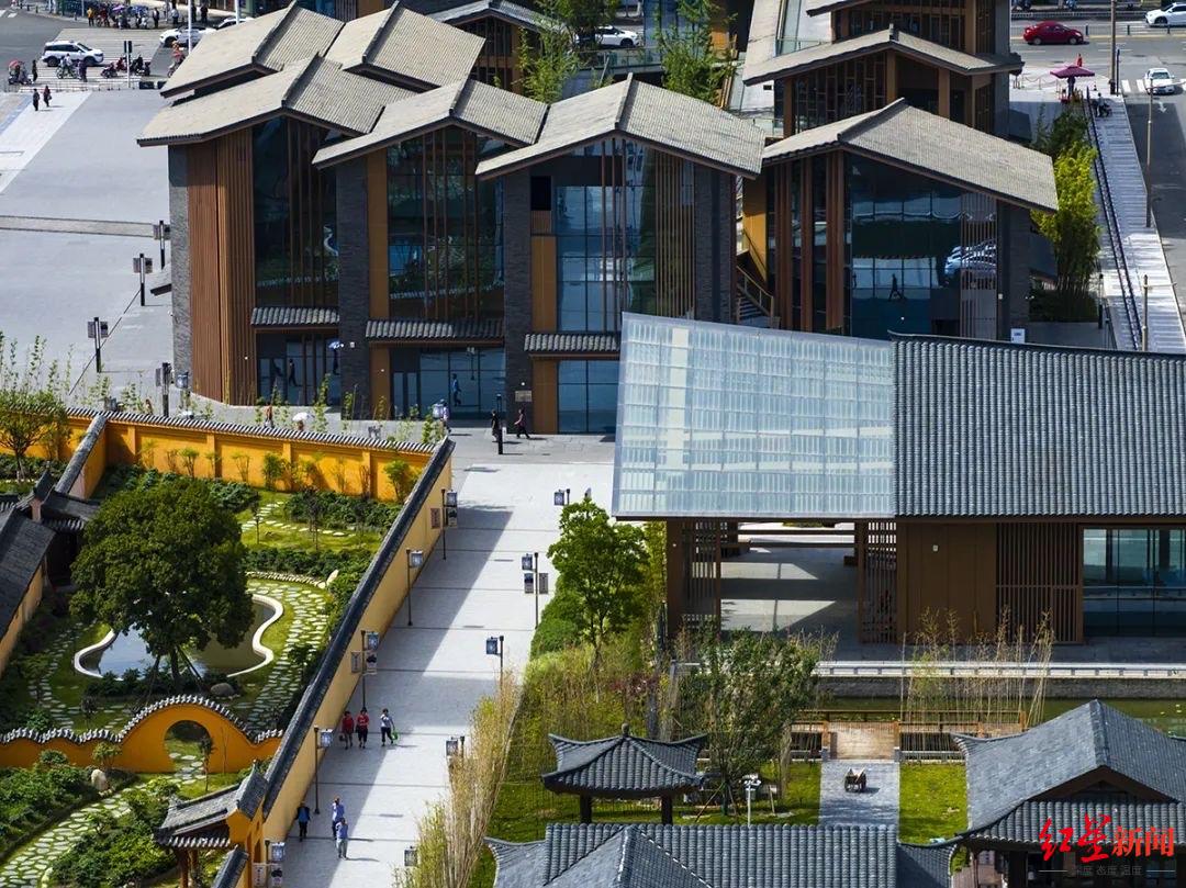 层叠的坡屋顶景观采用当地青瓦样式,并在此基础上构建了1.5公里长的空中步道系统。另外,龙兴老街自清代已存在,设计团队将其路面整体下沉3米,用老石板重铺,核心区中心打造40米宽的开阔水面,营造出“步移景异”的传统园林意境。