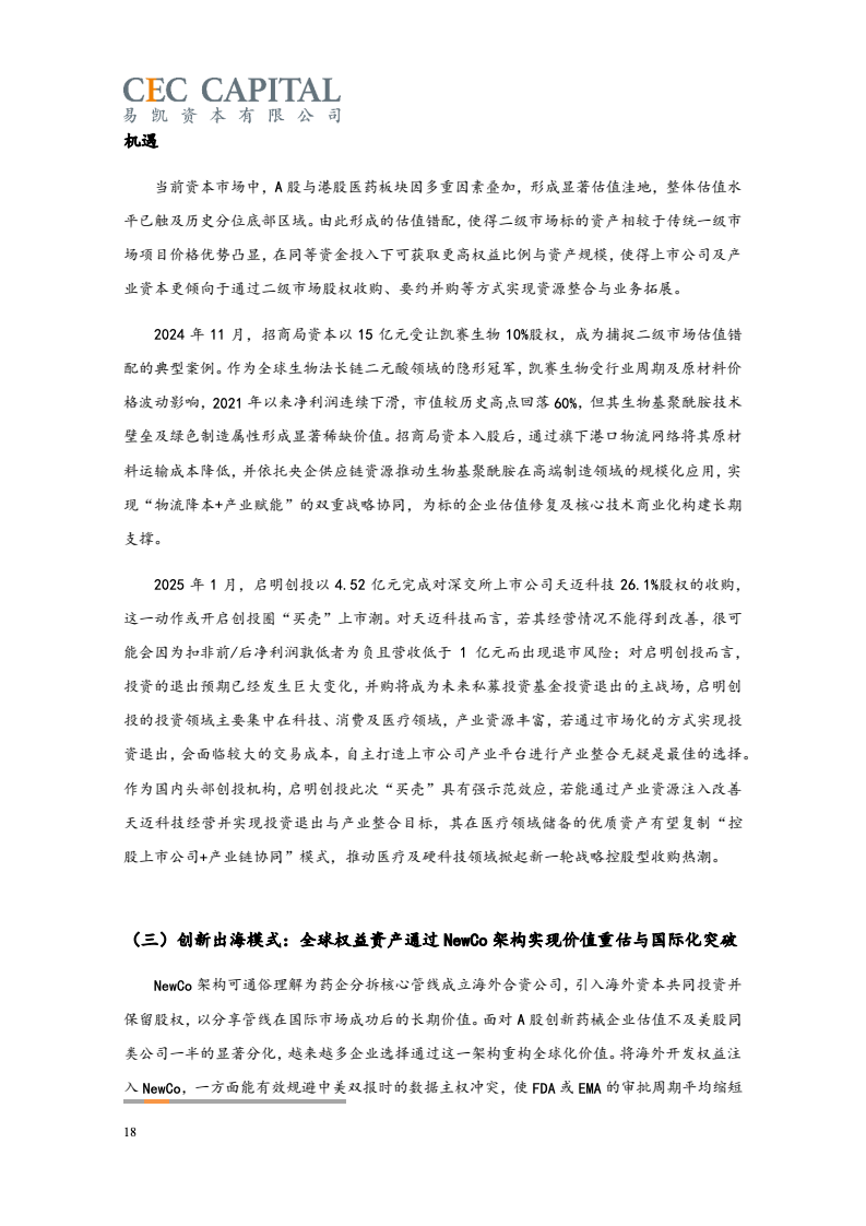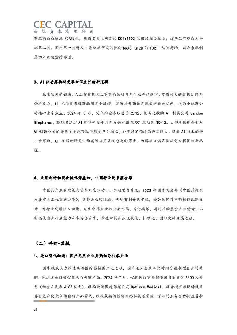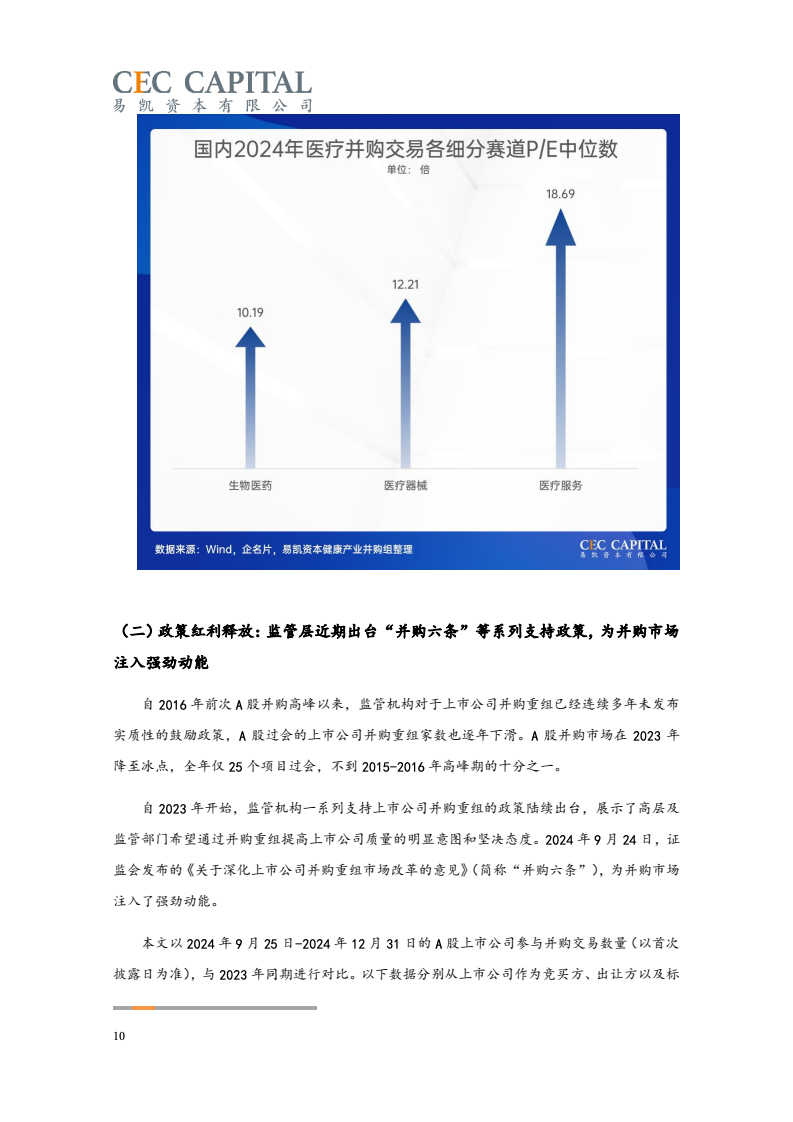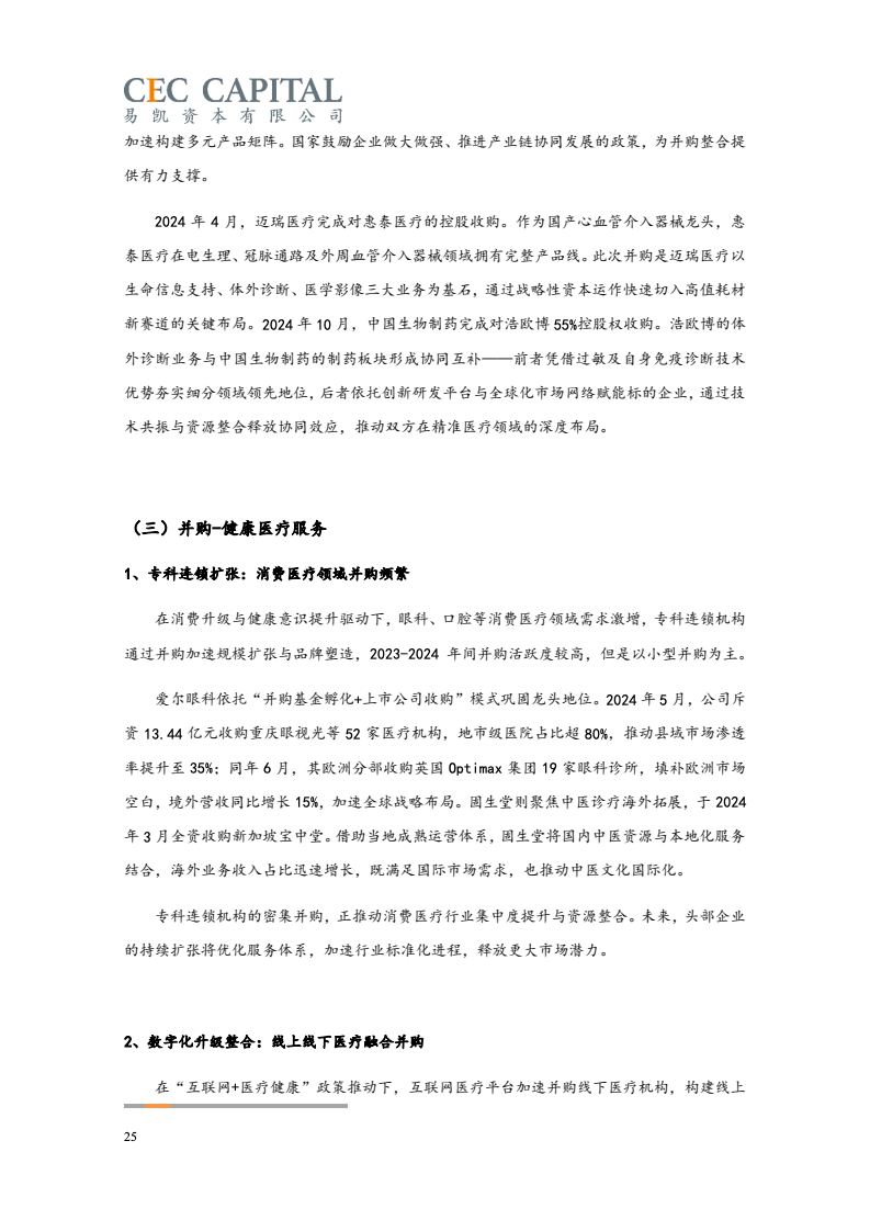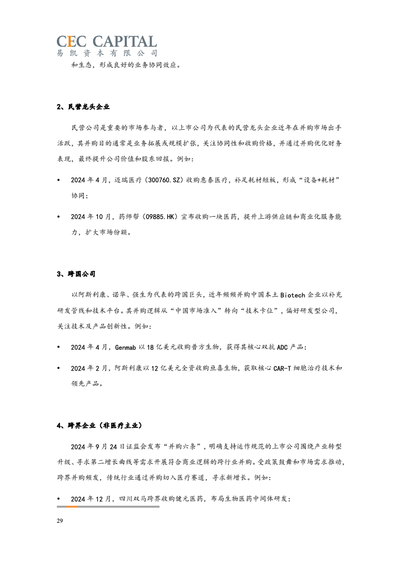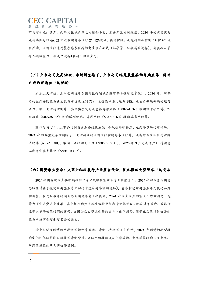 随后的2022年与2023年,因受疫情反复、经济波动、国际环境等多重因素影响,医疗健康领域并购交易的数量和金额均出现了连续下降。2024 年,国内医疗领域并购交易热度出现明显回升。一方面,“并购六条”等一系列支持性政策为并购市场带来了新的动能,上市公司参与热情明显提高。同时 IPO 路径的收窄也让并购成为了投资人退出的首要选择;另一方面,医疗行业估值窗口期的显现,国资积极参与产业整合,跨国资本通过并购、NewCo 等模式应对地缘政治风险等,也为行业的并购交易带来了新机遇。