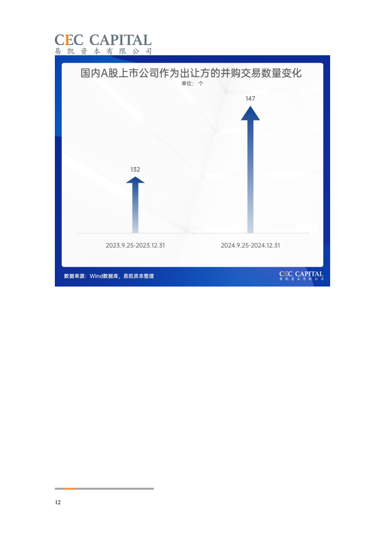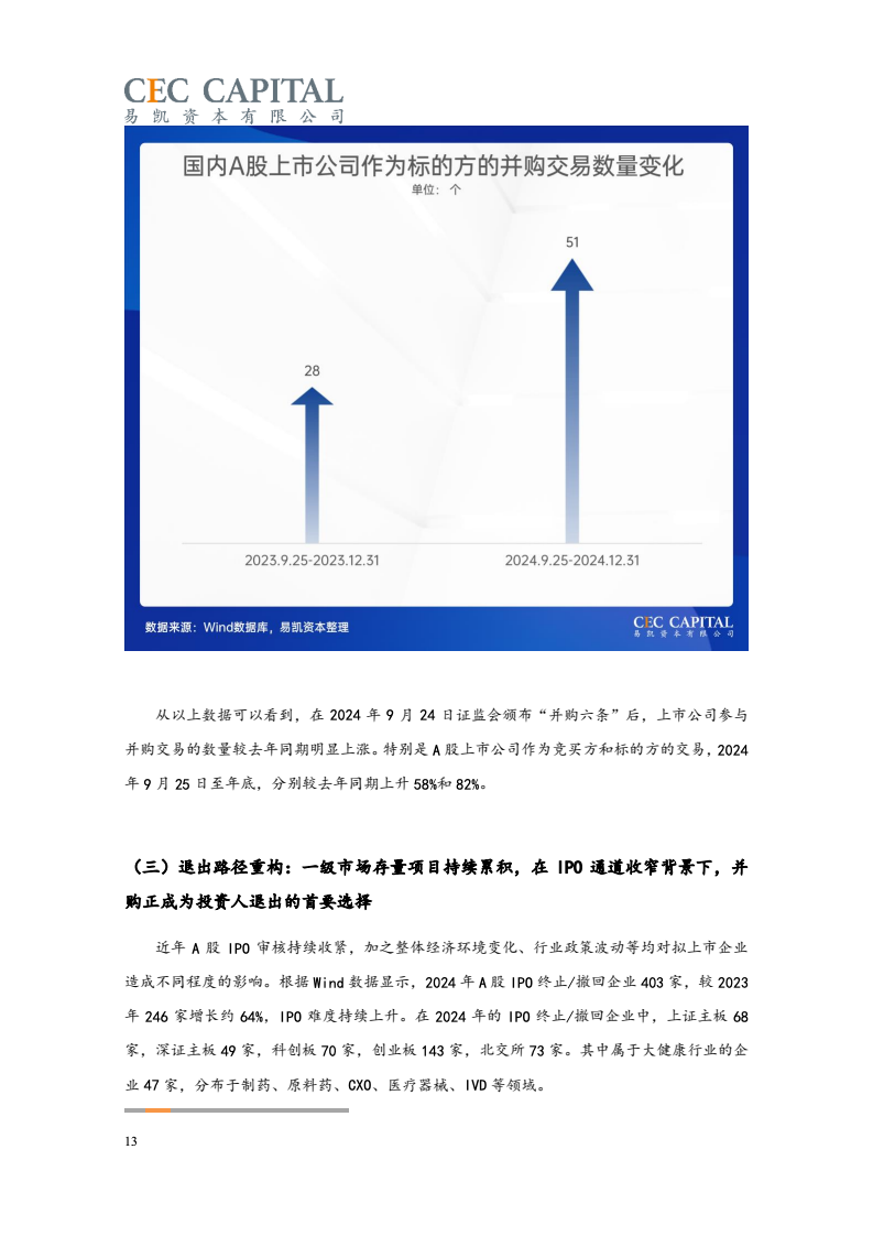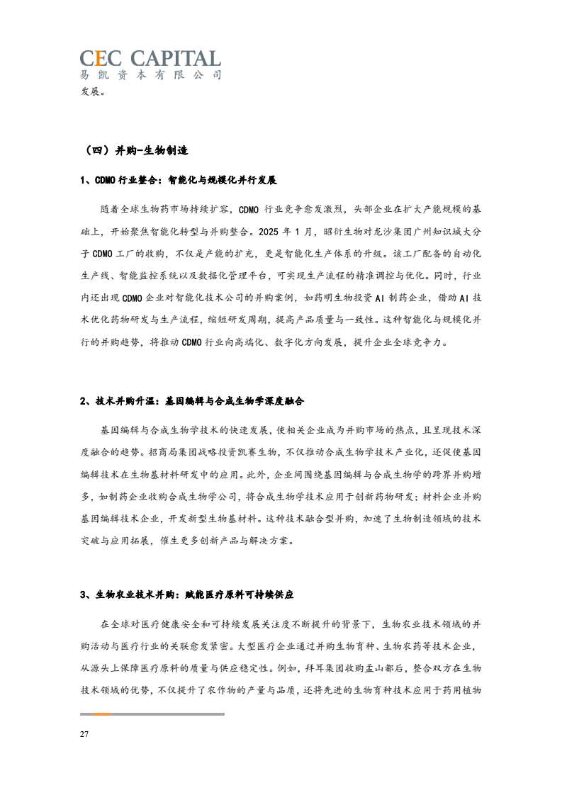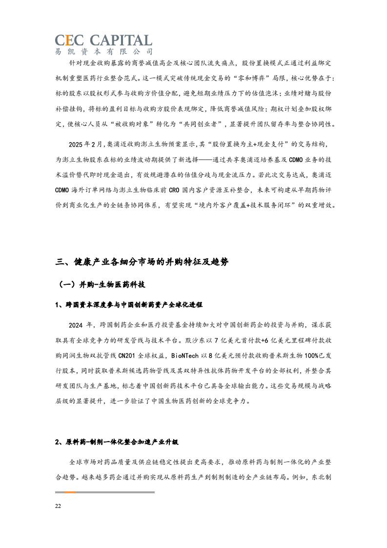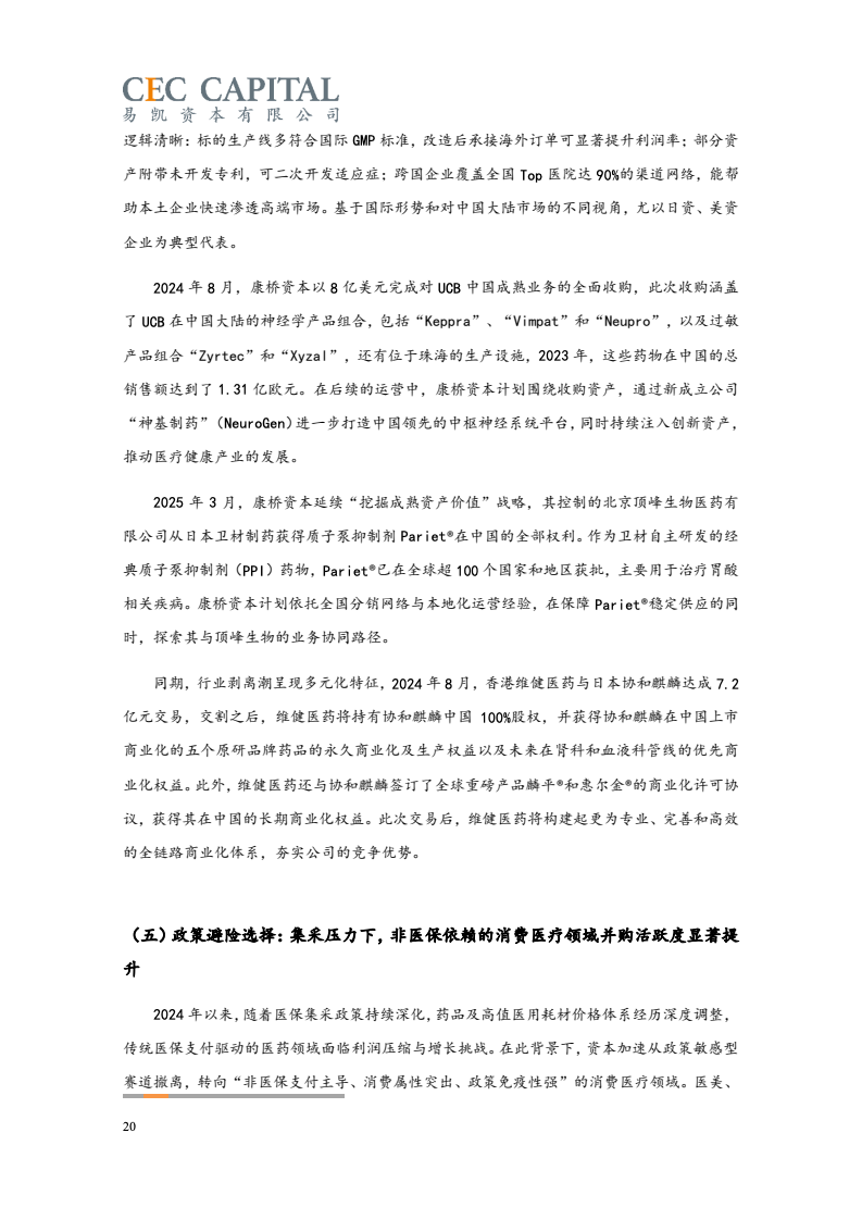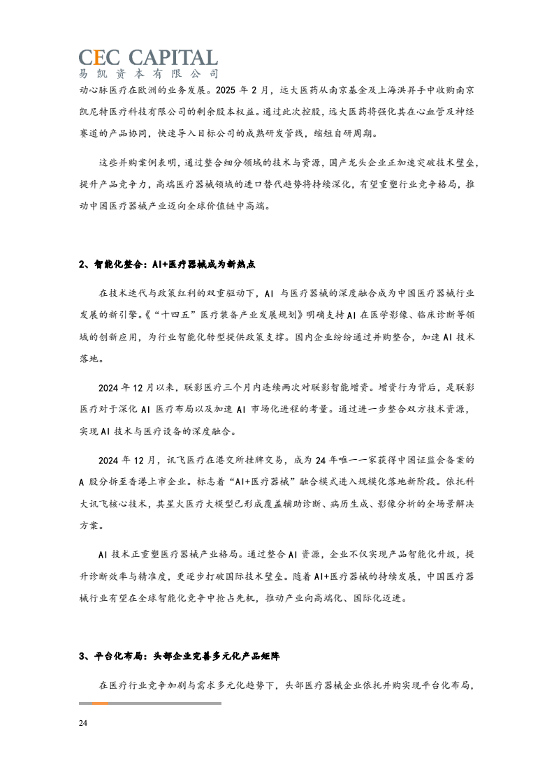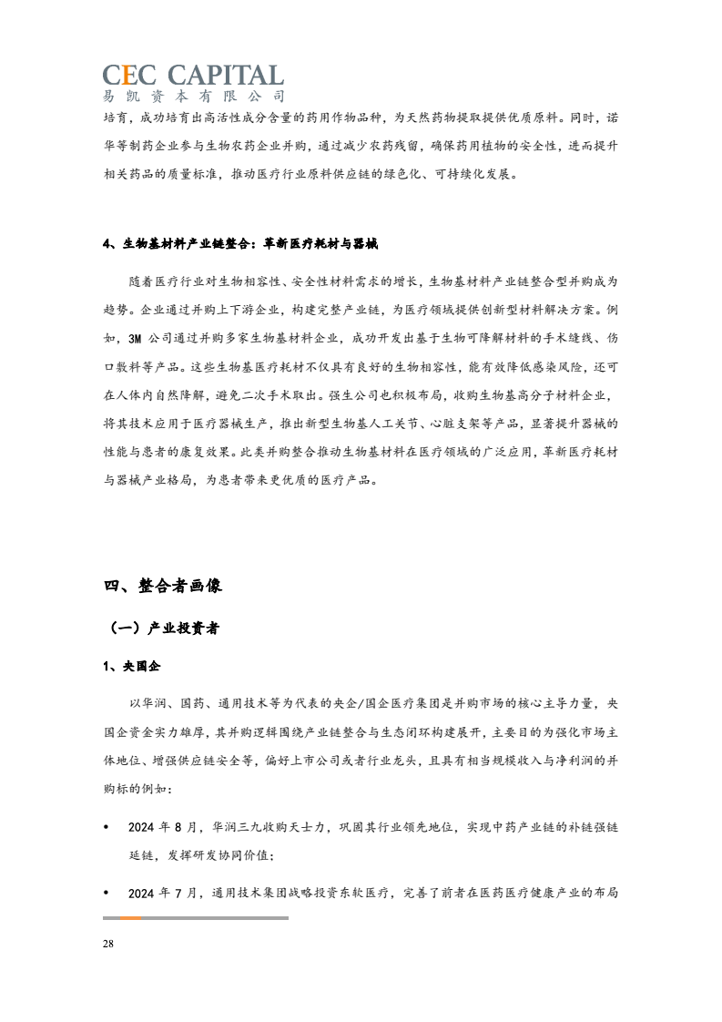 随后的2022年与2023年,因受疫情反复、经济波动、国际环境等多重因素影响,医疗健康领域并购交易的数量和金额均出现了连续下降。2024 年,国内医疗领域并购交易热度出现明显回升。一方面,“并购六条”等一系列支持性政策为并购市场带来了新的动能,上市公司参与热情明显提高。同时 IPO 路径的收窄也让并购成为了投资人退出的首要选择;另一方面,医疗行业估值窗口期的显现,国资积极参与产业整合,跨国资本通过并购、NewCo 等模式应对地缘政治风险等,也为行业的并购交易带来了新机遇。