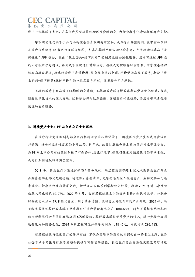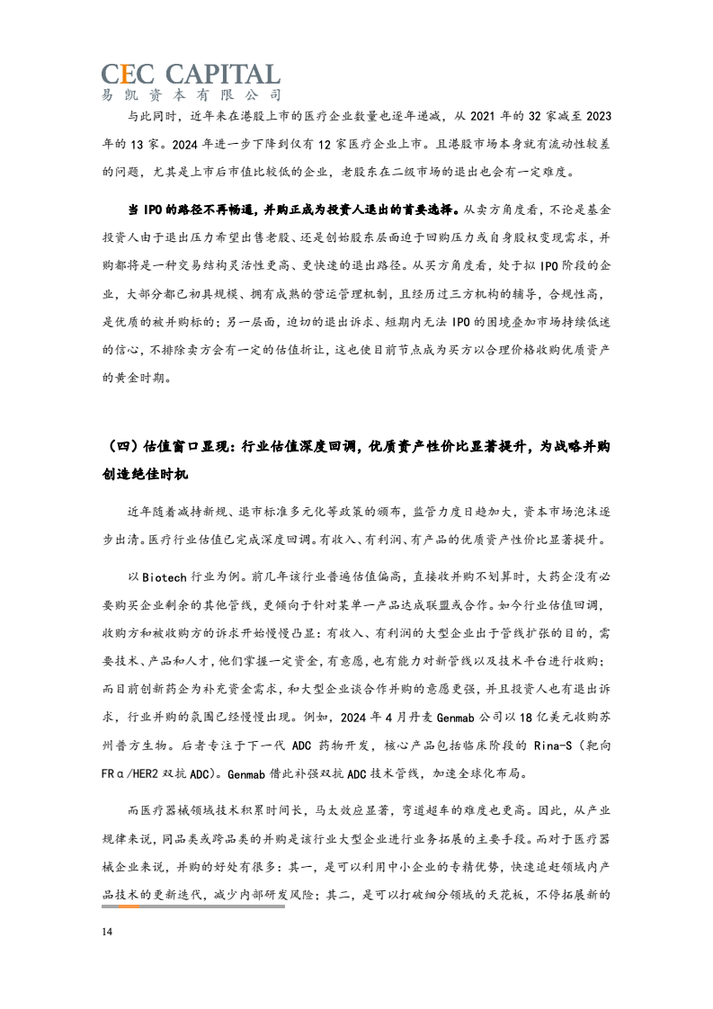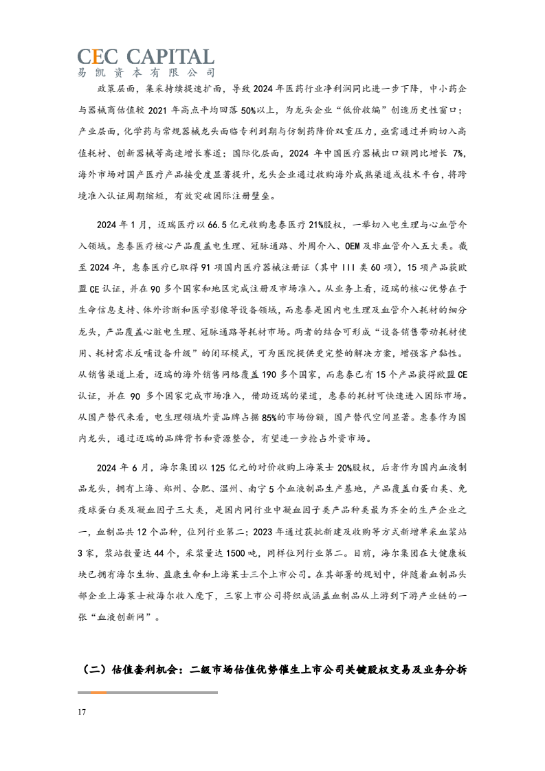 具体来看,2024 年国内医疗行业整体并购交易规模约 750 亿,较 2023年412 亿增长约82%;2024 年并购交易数量为 148笔,较 2023 年 126 笔增加约 17%。从并购交易金额角度,2024 年已恢复至近年较高水平。