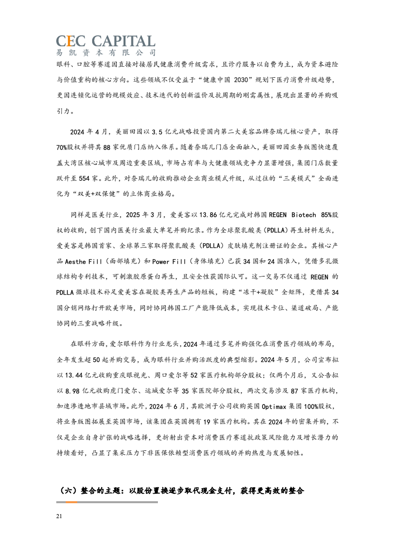 近年来医疗健康领域并购交易的高点出现在 2021年,当年出现了迈瑞医疗 5.3亿欧元收购海肽生物、华润医药 50亿收购博雅生物、海吉亚医疗超17亿收购苏州永鼎医院等标志性案例。