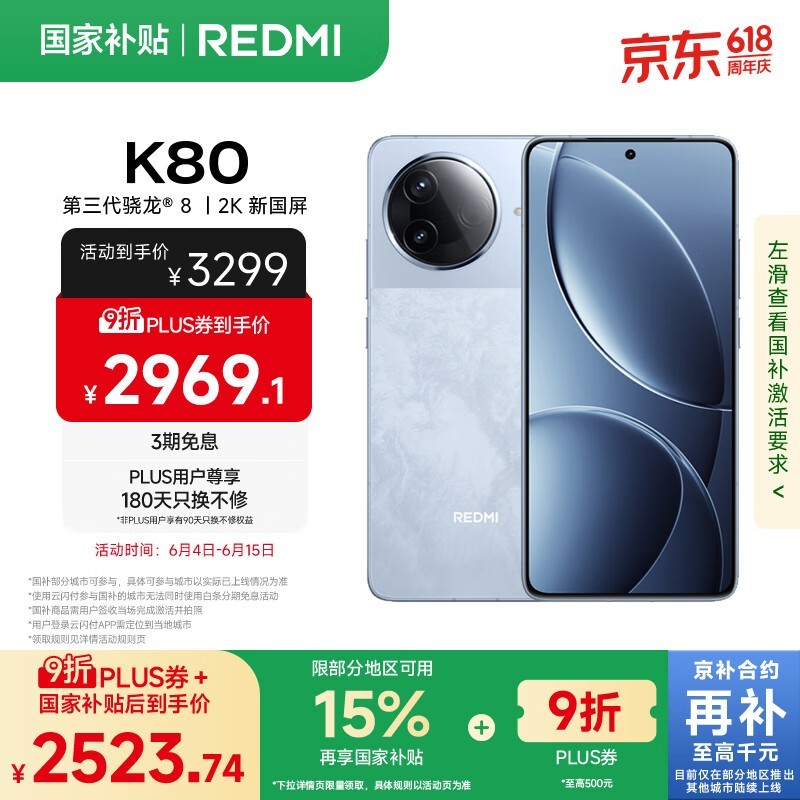 红米K80 5G手机16GB+1TB汐月蓝优惠价2509元
