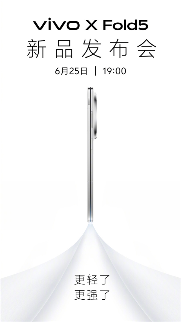 vivo X Fold5宣传语为“更轻了,更强了”,新机将打破X Fold3 219g全球最轻大折叠手机记录,重量预计会在200g左右。