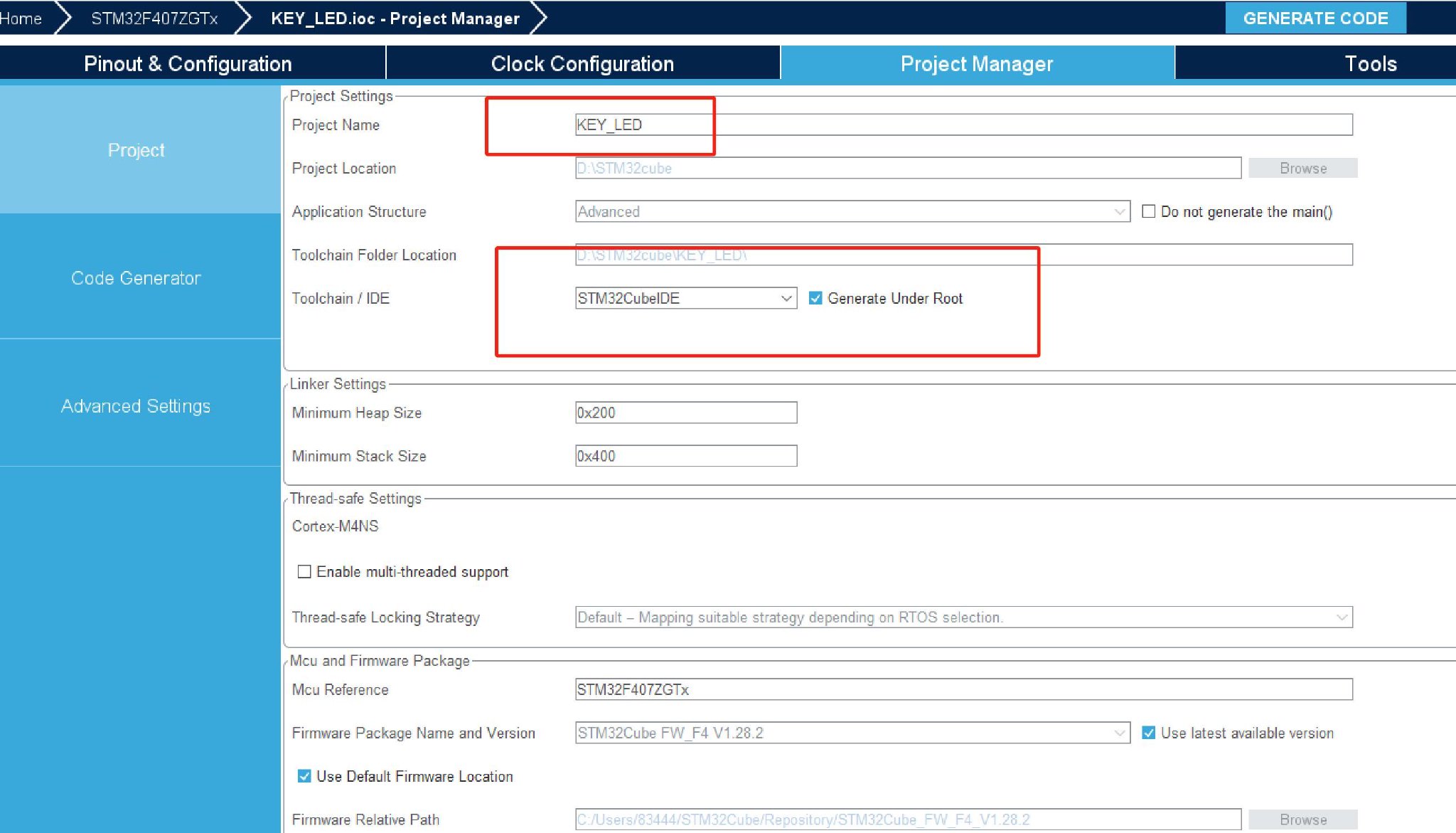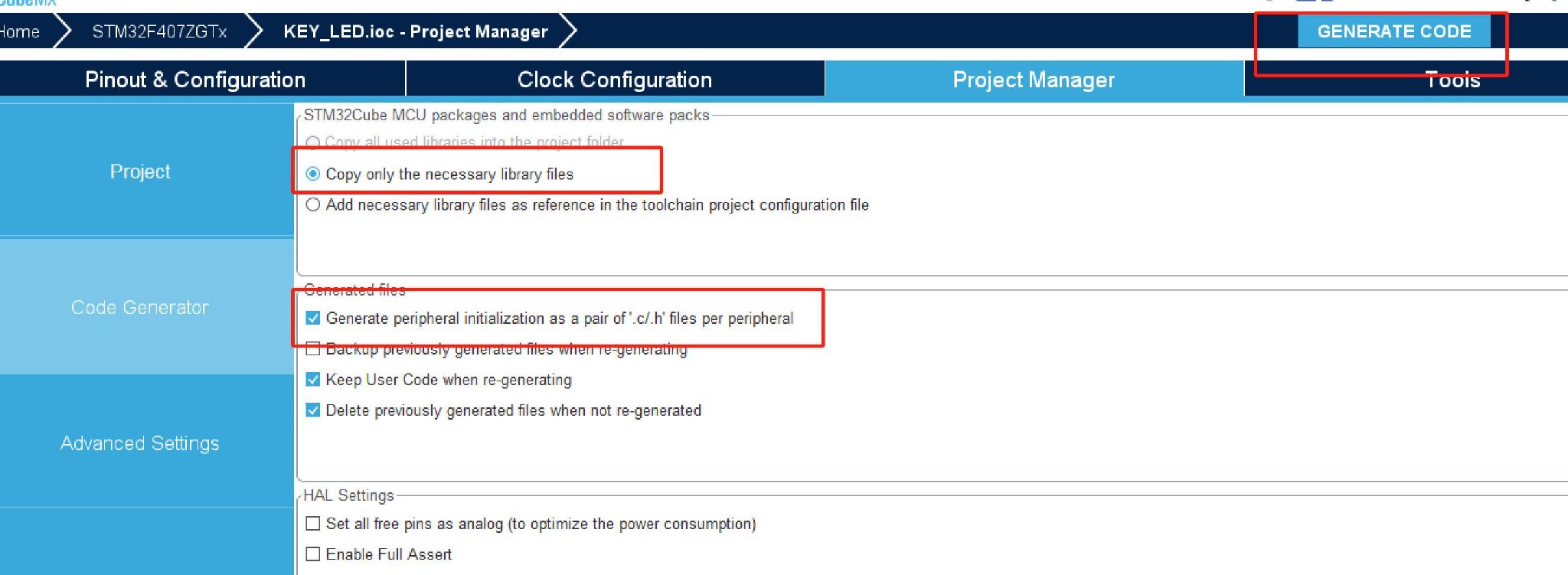 项目设置: 点击 Project Manager 选项卡。 设置项目名称(KEY_LED)和保存路径。 选择 Toolchain/IDE 为 STM32CubeIDE。 勾选 Generated peripheral initialization as a pair of '.c/.h' files per IP。