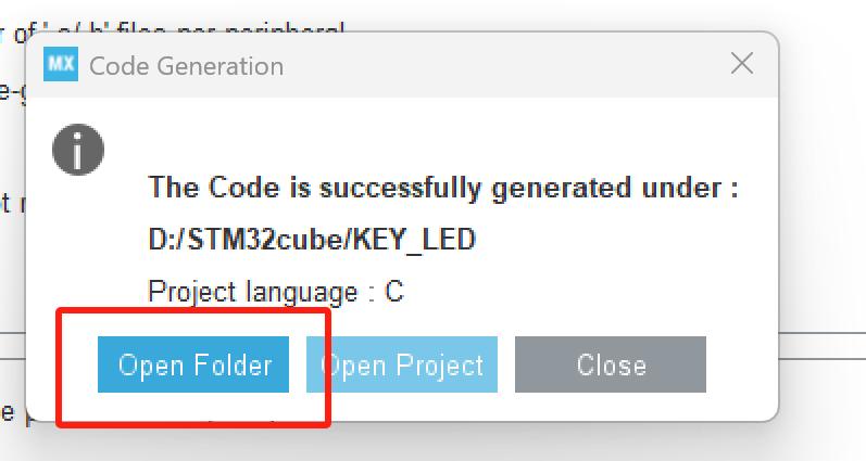 生成代码: 点击 Generate Code。 STM32CubeMX 生成项目文件后,点击 Yes 打开 STM32CubeIDE。