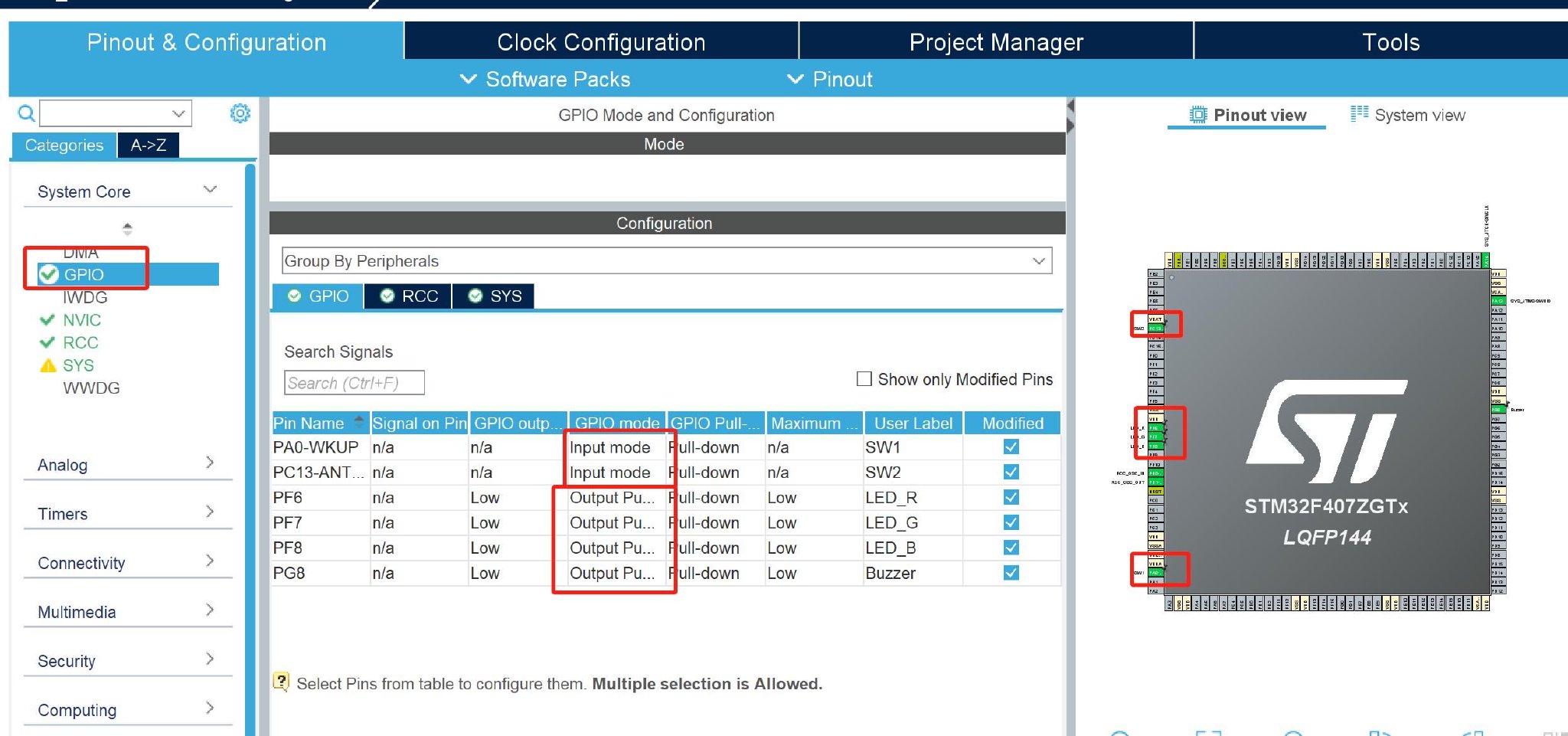 使用 STM32CubeMX 配置 STM32F407ZGT6 的 GPIO 引脚为输入和输出模式。