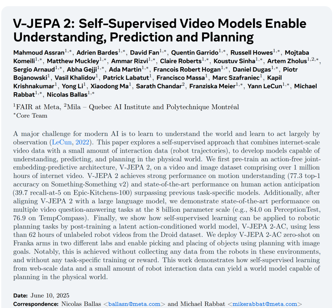 论文标题:V-JEPA 2: Self-Supervised Video Models Enable Understanding, Prediction and Planning