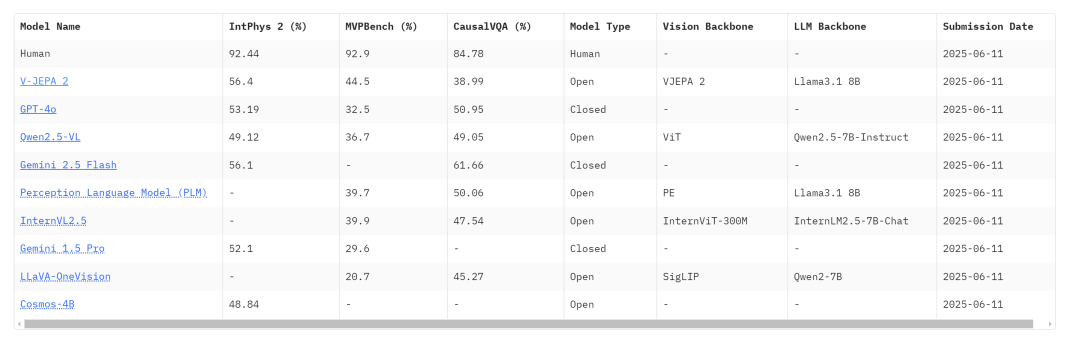 V-JEPA 2 在 Hugging Face 关于物理推理榜单上排名第一,超越 GPT-4o 等。